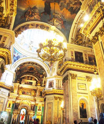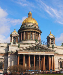 街の中心部にある聖イサク広場にそびえ立つドーム型の寺院です。寺院の名称はピョートル1世の守護者とされるビザンチンの修道士イサーキィ・ダルマーツキイに由来します。内装は聖書にモチーフを取った場面や聖人の絵(イコン画)が描かれており、絵画・聖壇に劣らず破風のレリーフなど絢爛豪華な装飾に目を奪われます。