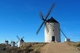 ラ・マンチャはスペインの中部に位置する歴史的地方の一つで、セルバンテスの「ドン・キホーテ」の舞台としても知られています。スペインらしい真っ白な風車の景色が見られるのもここ。赤茶けた広大なラ・マンチャの大地と地平線、さらに青い空と白い風車がその風景に溶け込む様子はまるで夢のようです。