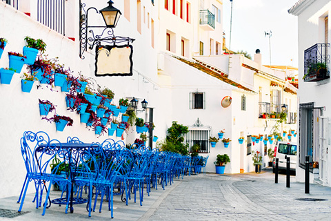 アンダルシアのミハス山麓に位置するミハスは、海抜420mの高台にあり、スペインで人気の「白い村」の中でも有名なリゾート地です。白壁にかけられたブルーの鉢や花がなんとも可愛らしく、歩いているだけで幸せになれるような場所です。のんびり散策しながら雑貨屋さんでお土産選びをするのもおすすめです。