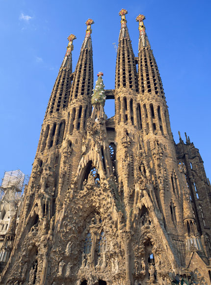 1882年に起工式が行われてから実に130年以上も建設が行われているバルセロナのシンボル。カトリックの贖罪教会で日本では聖家族教会とも呼ばれています。着工の翌年からガウディが2代目建築家として就任し、1926年に73歳で亡くなるまでその建設に携わりました。ガウディは仔細な設計図を残していなかったため、模型や紐と錘を用いた実験道具を使って、構造を検討したとされています。内戦によってそれらの資料の大部分が消失してしまいましたが、外観のデッサンなど残されたわずかな資料を元に、歴代の建築家がガウディの設計構想を推測し、現在も建設が行われています。「西端のファサード」「受難のファサード」「栄光のファサード」という3つのファサードは細かな彫刻が施されており、その美しさは必見です