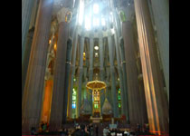 一歩聖堂の内部に足を踏み入れると静謐な空間が広がっています。ガウディは聖堂を、信者が神との一体感を体感できる場にしようとしました。何本もの柱が天井を支えるため林立している様子は、さながら森の中のようです。