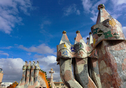 カサ・バトリョとは、和訳すると「バトリョ邸」。繊維業界のブルジョワであったバトリョ家より、建物の増改築がガウディに依頼されました。この建物のテーマは海。正面の壁は海面のように波うち壁に貼られた色ガラスは、海面に光が反射するように美しく輝いています。自由奔放にタイルが使われ、曲線が多用されたデザインは一際目をひきます。