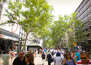 カタルーニャ広場から港のコロンブスの塔に向かう約1.3kmに渡って延びるバルセロナ旧市街の目抜き通り。通りの両側に広がる本屋や花屋、カフェなどを冷やかしながら、のんびり歩きましょう。