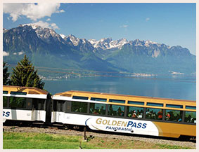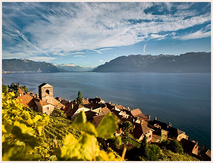 ブドウ棚が広がるラヴォー地区とレマン湖の景観は世界遺産にも登録され、ゴールデンパスラインに乗車すると、車窓からその景色をご覧いただけます。秋になると黄金色に染まったブドウ棚が、訪れる人々を魅了します。