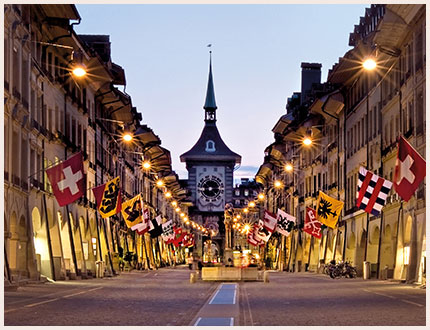 スイスの首都であり、旧市街一帯が世界遺産に登録されているベルンは赤い屋根と石畳の街並みが象徴的です。町の起源は12世紀にも遡り、当時一帯を支配した公爵が熊(ベア)を狩ったことからこの街の名前が付いたとも言われています。旧市街の郊外には実際に熊公園があり、街の人々から愛される熊が飼育されています。また、メイン通りには噴水がいくつも並び、中心には16世紀から休むことなく時を刻み続けている時計塔があります。