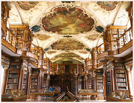 15万冊の蔵書を誇るロココ様式のこの図書館は内装が非常に美しく、壮大なスケールの知の集積は、訪れるものを圧倒します。中世の美しい家並みと、近代的な都市の様子が見事に調和する旧市街は、街の歴史の深さを感じさせる魅力があります。