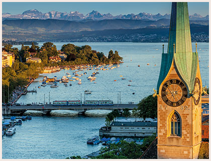日本から直行便が就航するスイスの玄関口。経済、文化の中心でもありながら、中世の建物やローマ時代の名所も数多く残るマルチな都市です。
