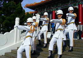 「忠烈士」…衛兵交代式を見学。一糸乱れぬ隊列を組んだ行進は美しく見事です。忠烈祠の守衛は陸海空軍が交代で行うのですが、軍服の色が青いのは空軍、白は海軍、そして緑は陸軍になっています。