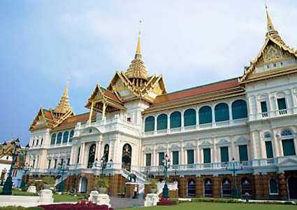 ワット・プラケオ(エメラルド寺院)と同じ敷地内にある王宮には、ラマ1世から5世まで現王朝の歴代の王様が暮らしていた王宮が立ち並ぶ。(現在の国王ラマ9世はここではなく、チットラダー宮殿で暮らしている)。1784年、ラマ1世がバンコクに都を定めた現在の王朝であるラタナコシン王朝を築いた際、国王が住む王宮と国家の行事を取り行うための施設として建てられた。現在、王宮では日常的な公務は行われていないが、戴冠記念日など特定の儀式や祭典は行われている。王宮の中でもひときわ異彩を放つ白亜の壮麗な建物が、敷地のほぼ中央に位置する19世紀末に建てられたチャクリー宮殿だ。イギリス人建築家によって西洋のルネッサンス方式とタイの伝統的な建築が融合して建てられており、現在では外国の賓客を迎える際に使用されている。