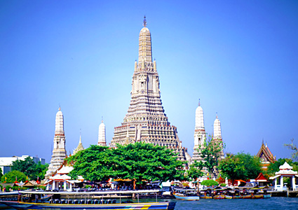 チャオプラヤー川西岸に建つ大仏塔、ワット・アルン(暁の寺)は、三島由紀夫の小説「暁の寺」の題材にもなった。ワット・アルンの塔の表面には無数の陶器の破片が埋め込まれ、精微な装飾が施されている。対岸からも一際目立つ大仏塔の高さは75メートル、台座の周りは234メートルもある。大仏塔の周りにある4基の小塔も大仏塔と同じ造りをしており、それぞれ仏蛇の誕生、悟りを開いた仏蛇、初めて法を説く仏蛇、仏蛇の入滅を表した仏像が納められている。ヒンドゥー教の聖地カイサーラ山をイメージして造られたため、他のタイ仏教寺院とは趣を異にしたつくりとなっている。実際に大仏塔の上まで登ることもでき、上のテラスからはチャオプラヤー川をはじめ、辺りの雄大な眺めを楽しむことが出来る。
