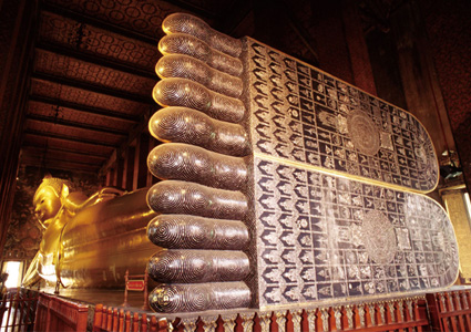 ワット・ポー(涅槃仏寺院)はアユタヤ王朝末期のプラペートラチャ王時代の1788年に、ラマ1世によって建立されたバンコク最古の寺院であるとともに、タイ式マッサージの総本山として知られている。ワット・ポーの見所は長さ46m 高さ15mの金色に輝く巨大な寝仏である。横たわっているのは、悟りを開いたことを意味しており、偏平足は超人であることを表している。大きな足の裏には仏教と深い関わりを持つバラモン教の宇宙観が、108の絵で表されている。