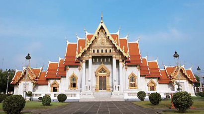1899年 ラマ5世によって建てられた王立寺院で屋根を除いた建物のほとんどが大理石で出来ているため、「大理石寺院」と呼ばれている。大理石はイタリアのトスカーナ州から運ばれてきたもので、屋根の瓦にも通常の焼き方とは異なる鮮やかなオレンジ色のものが、金張りの窓にはステンドグラスがはめ込まれている。大理石寺院の境内には緑豊かな庭もある。