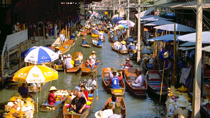 ダムナンサドゥアクの水上マーケットはラマ4世時代の1868年に造られた運河に伝統的な文化の保護と観光客誘致のために開発されたマーケット。野菜や果物を載せた小船が水路を往来し、活気あふれる風景を見ることができ、昔ながらのタイの暮らしを垣間見えるスポット。