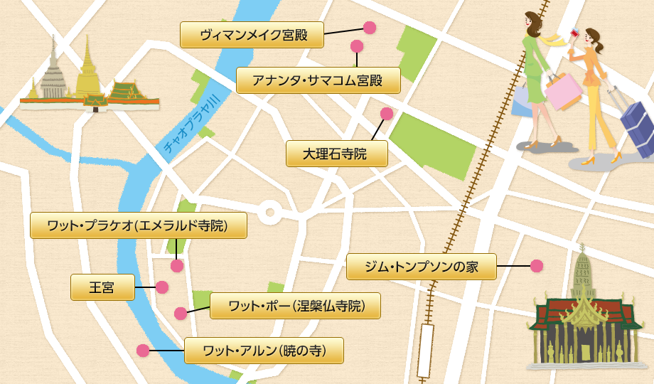 バンコクはタイの現在の首都で政治・経済・教育・文化の中心地。華やかな大都会の賑わいと厳かな仏教文化が息づき、古今の歴史と文化が調和した国際都市。モダンな高層ビル群や巨大なショッピングモールの足元には、屋台での買い物や食事を楽しみ、道すがらの小さな祠に手を合わせる人々の姿が見られる。中心部ではチャオプラヤー川が流れ、川沿いには多くの寺院が並び、ボートでの遊覧やディナークルーズも楽しめる。