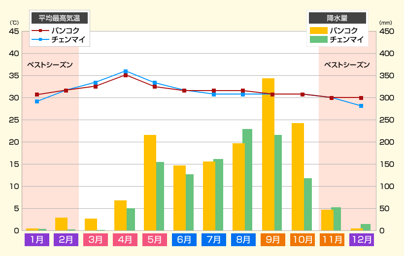 タイは気候によって暑季の4~5月、雨季の6~10月、乾季11~3月の3つに分けられます。暑季は1年の中で最も気温が高く、35℃~40℃になる日もあります。雨季は1日に数回スコールに見舞われることもありますが、1日中雨が降り続けるようなことはありません。乾季はほとんど雨が降らず、気候は安定しています。そのため、乾季の11月~3月の間がタイへの観光のベストシーズンとなっています。