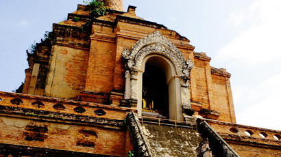 ワット・チェディルアンは1391年、メンラーイ王朝第7代セーンムアンマー王(1383~1402年)が亡くなった父を偲んで建立したと伝えられる、チェンマイで最も大きな(ルアン)仏塔(チェディ)のある寺院。仏塔は、創建当時で高さ約80メートル、四角い形した基壇の一辺も約60メートルと巨大なもので、チェンマイ市の真ん中にそびえ立っていた。ワット・チェディルアンの現在の仏塔は1545年の大地震で先が壊れ、後に文化庁が現在の形に修復した。入り口付近に建つ本堂は、ランナー様式の仏像が数多く祀られている。