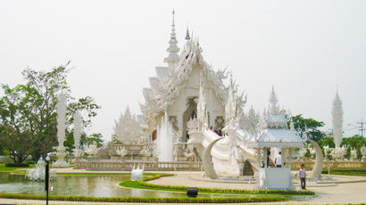ワット・ロンクンはチェンライ出身のアーティストがデザインした寺院。1997年から建設が始まり、純潔をイメージした寺院の外観は白一色で現在も増築を続けている、建物内部に入ると壁面には現代のポップカルチャー由来のモチーフが、仏教的文脈における善悪を表現するよう描かれている。