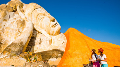 広々とした草原に並ぶ遺跡群の一番奥に高さ5m、全長28mの巨大寝釈迦仏がある。ワット・ロカヤスタは1956年に復元されたもので、80歳で入滅した仏陀を表している。ワット・ロカヤスタの周りには寺院も本堂もなく真っ青な空、澄みきった空気のもと、長い手足をゆったりと伸ばし、静かな笑みを浮かべているかのように横たわりながら、繁栄を続けたアユタヤ王朝から今に至るまで、時代の栄枯盛衰を見つめ続けている。