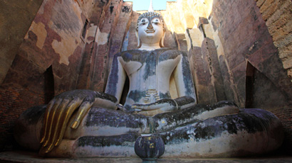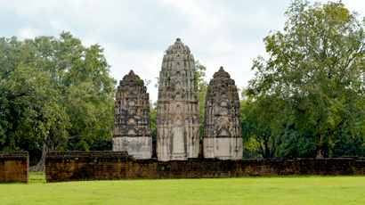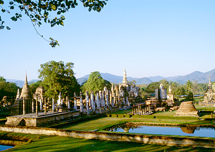 タイ北部の南端に位置する古都スコタイ。「幸福の夜明け」を意味するその名のとおり、1238年ここにタイ族による最初の王朝が開かれた。仏教の布教に熱心だった代々のスコタイ王は、これら三都市の至るところに仏教寺院を建造し、現代に残ったそれらの遺跡が美しい歴史公園として整備されている。当時の栄華を偲ばせる荘厳で美しい遺跡群は、東南アジアで最も価値のある史跡のひとつとしてユネスコの世界遺産にも登録されている。