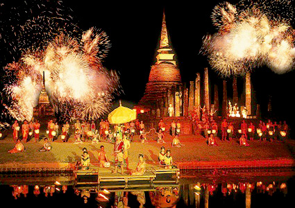世界遺産のスコタイ遺跡公園でライトアップされた遺跡をバックに、タイ族最初の独立国家「スコタイ王国」の歴史絵巻をスコタイ地方の踊りや民族楽器による生演奏で再現。音と光の祭典 スコタイナイトのクライマックスには伝統手法の打ち上げ花火が夜空を覆い、池には灯篭が星のように瞬く見どころ満点のショー。