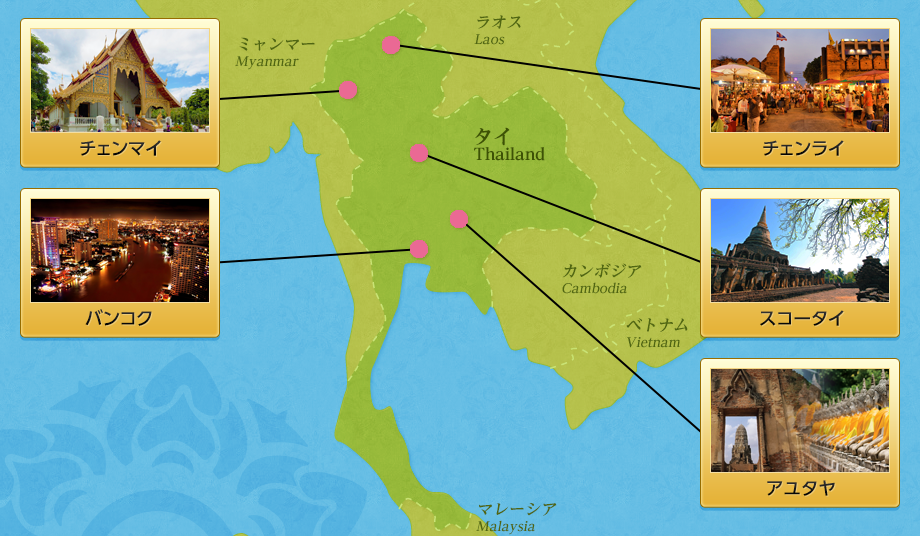 タイの魅力は首都バンコクだけではありません!世界遺産アユタヤ遺跡、北方のバラとも称される美しい古都チェンマイ、タイ最北の地チェンライ、世界遺産スコタイ遺跡公園と各都市ならではの歴史や文化を感じていただけます。また、クラブツーリズムではロイクラトン祭り、ゾウ祭りなど楽しいイベントやお祭りに参加するツアーもございます!