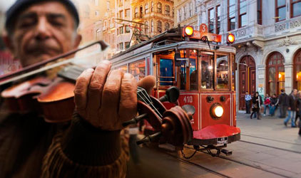 昔はオスマン帝国の銀座であったイスティクラル通り、現在はイスタンブールの繁華街です。昔から残る建物から、最新の流行品、名物のチョコまで様々なトルコを楽しめる街です。通りを走る赤いチンチン電車(トラム)がこの通りのシンボルです。