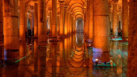 イスタンブール旧市街の地下に広がるかつての貯水池が地下宮殿です。薄暗い宮殿内ですが、柱やアーチがライトアップされ幻想的な雰囲気を作り出しています。宮殿の最奥部にはメデューサの首が横たわっているので、ぜひツーショットでお写真をどうぞ。