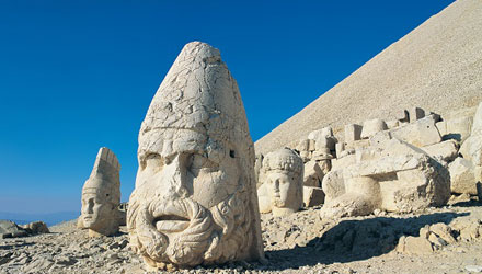 トルコの東部・南東部にも多くの遺跡が眠っています。観光の目玉といえばネムルート山です。その頂は台座を転げ落ちた石像の頭部が並び、不思議な光景をつくりあげています。日の出に照らされ刻々とその表情を変えていく石像群は非常に神秘的で一瞬たりとも見逃せません。