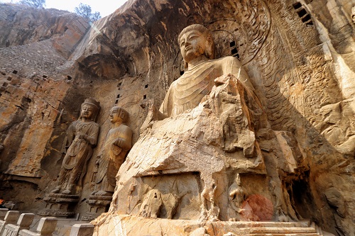 洛陽市の南13キロ、伊河畔に建てられ、敦煌の莫高窟、大同の雲崗石窟と並ぶ中国三大石窟の一つです。北魏の皇帝孝文帝が山西省の大同から洛陽に遷都した494年頃より開削が始まり、宋代まで約400年に渡って10万体の仏像が刻み込まれました。代表的な石窟は、北魏の宮廷生活を描かれている「賓陽三洞」、数センチの小仏が15,000体も彫られている「万仏洞」等があります。唐代に龍門石窟は最盛期を迎え、その絶頂期の石窟が、675年に完成した「奉先寺洞」です。龍門最大の石窟で、その本尊高さ17メートルの廬舎那仏は則天武后をモデルにしたと言われています。北魏時期に作られた他の仏像に見られる西方のヘレニズムの影響を感じさせない、中国的造形美の代表です。