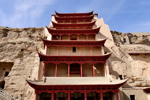 シルクロードのオアシス都市、敦煌市の東南25キロに位置し、鳴沙山東端の断崖絶壁に開削された大規模な仏教石窟群です。大同の雲崗石窟、洛陽の龍門石窟と並ぶ中国三大石窟の一つです。366年に仏教僧が彫り始め、1000年に渡って彫り続けられました。現存する窟の数は492窟あり、その内最も古いものは5世紀前半の北涼期に造られました。その後も北魏、隋、唐、五代、元と途切れることなく開削されました。各時代に造られた窟を見学できますので、時代による彫刻様式や壁画の画題等の違いを感じることができます。莫高窟は特に壁画の内容と保存状態ともに仏教美術の精粋と言うことができ、その総面積は約45,000平方メートル、並べたら30キロの長さになります。一般に開放されている石窟は約27窟で、他に別途料金を支払って見学できる特別窟が約13窟あります。