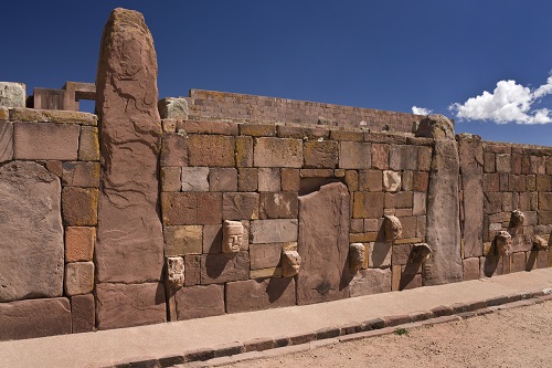 アンデス山脈中央、標高3850メートルの高地に、紀元前から1200年頃まで続いたといわれる都市の遺跡です。ピラミッド神殿や、神殿複合建築が残り、赤地に多彩色で文様を描いた土器や石彫人像などが出土しています。15キロメートルも離れたチチカカ湖から灌漑用水を引くほどの技術もあったといいます。他地域でもティワナク文化の影響を受けた土器が出土していることから、この都市が周辺に与えた影響も大きかったと考えられています。インカの祖先を生んだ文化ではないかとも考えられている貴重な遺跡です。