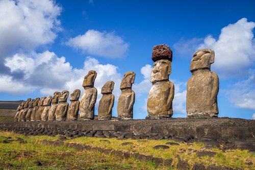 人面を模した石造彫刻・モアイ像で有名な島、イースター島は1888年にチリ領になり、その際イスラ・デ・パクスア(イースター島)と名付けられました。チリの海岸から3800キロメートル、タヒチから4000キロメートル、人間の住む一番近くの島でも1900キロメートルも離れた太平洋に浮かぶ小さな島です。イースター島は周囲58キロメートル、総面積165平方キロメートルと小さいですが、約900体のモアイがあちこちにあります。モアイ像の大きさは3.5メートル・重量20トン程度のものが多いですが、最大級のものは20メートル・重量は90トンに達します。