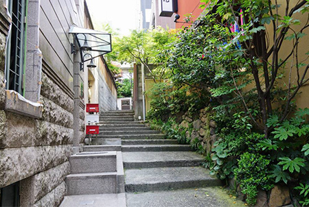 新宿区にある、大久保通り交差点から外堀通り交差点までの坂。石畳の路地裏が続くその町並みは、どこかパリを思わせます。