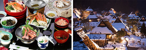 左:冬の味覚カニ御膳の昼食(イメージ)/右:美山かやぶきの里 冬灯廊(イメージ/天候により見られない場合があります)