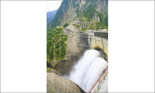 7年の月日と述べ1,000万人の人手により完成した「世紀の大事業」黒部ダム。隣接する200段ほどの階段を行くと展望台に到着し、毎年6月26日から10月15日までの期間、ダムの観光放流が見られます。
