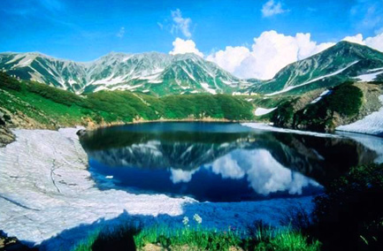 夏のアルペンルートは、最高地点「室堂平」での高山植物観察がおすすめ。 雪解け水で満ちたその水面に立山の山々が映しだされ、周囲を囲うように設けられた散策コース沿いにたくさんの高山植物が咲き誇ります。運が良ければ高山植 物に混じって、ほわほわの毛におおわれたヒナ鳥を連れたライチョウの親子連れに逢えるかも。室道平に一年で最も多くの花が咲き、見渡す限りの緑のじゅうたんは下界の暑さを忘れてしまうほどの爽やかさです。