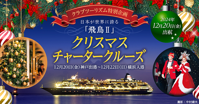 クラブツーリズムの「飛鳥Ⅱ クリスマスチャータークルーズツアー・旅行」!日本が世界に誇る「飛鳥Ⅱ」のクリスマスチャータークルーズで、クリスマス限定のディナーや華やかなショーをお楽しみください。ツアーの検索・ご予約も簡単!