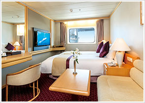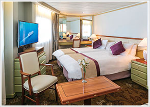 ツインベッド、ソファー、バスアメニティーなど、クルーズライフに欠かせないものが揃った客室。安心して船の旅をお楽しみください。