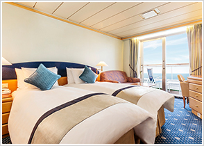 全室が海に面した客室には、バスタブとツインタイプのベッドを完備。クルーズライフを快適にするさまざまな設備をご用意しております。