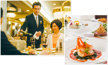 ディナーは、本格的なフレンチを中心とし、クルーズによっては和食などバラエティ豊かなメニューをご用意しております。