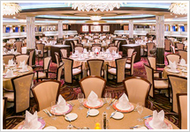 『飛鳥II』のメインダイニング。エレガントで広々とした空間では、本格的なフレンチから、旬の食材を活かした和食までバラエティ豊かなメニューをご用意しております。