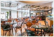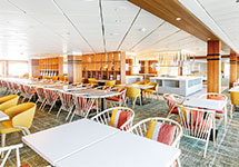 オープンデッキで爽やかな風を感じながら食事ができるビュッフェスタイルのレストラン(朝食・昼食)。ちょっとお腹のすいた午後には、リドグリルでハンバーガー、アイスクリームなどの軽食も楽しめます。