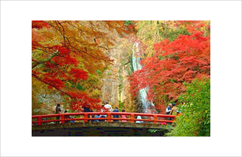箕面公園の中でも色づく時期が遅いといわれる「箕面大滝」周辺は、燃えるようなモミジやカエデが色づき、さわやかな空気が流れ、多くの紅葉狩りの観光客でにぎわいます。