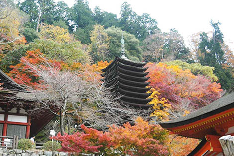 談山神社(たんざんじんじゃ)は、大和路を代表的する紅葉の名所であり、木造としては我が国唯一の「十三重塔」が彩られる様は、一度見たら忘れられない、見事な全山紅葉です。