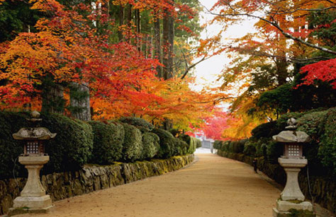 針葉樹が多い「高野山」ですが、紅葉の時期は奥の院や蛇腹道など赤く色づく場所が多く、お寺とのコントラストは見事です。仏教の聖地「高野山」の神聖な空気を味わいながら紅葉観賞をお楽しみください。