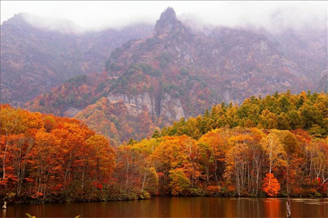 北アルプス独特の渓谷美、奇岩と相まって燃えたつような紅葉は圧巻。
