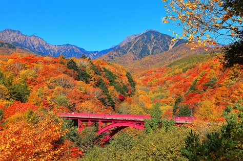 谷間をぬうように走る「黒部峡谷トロッコ電車」からの景観が最も有名で、車窓に流れる断崖絶壁の紅葉の大パノラマは圧巻!