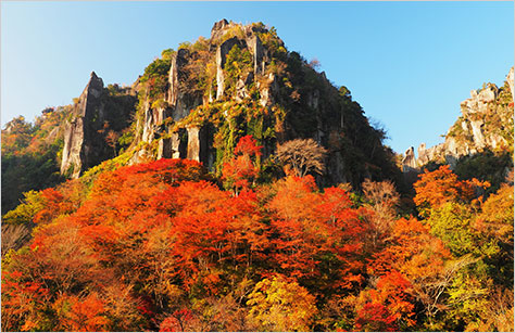 展望台からは、荒々しい岩肌に張り付くようにカエデ、モミジ、イチョウなどが紅葉する美しい光景を見渡すことができ、その目を見張る美しさは、訪れる人々に自然の偉大さをあらためて語りかけてくるようです。