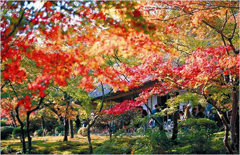 SNSで話題のスポット!紅葉シーズンには、お寺では広間の畳を一部はがしてアクリル板をはめ込み、庭園の紅葉を逆さに移る「逆さ紅葉」が見どころです。