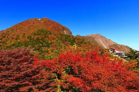 雲仙温泉街の東に位置する仁田峠は、燃えるような鮮やかな紅葉が山々を染め尽くす紅葉の名所。